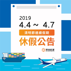 【2019年清明連假 營業時間調整通知】 因應2019年4月4日~4月7日清明連假 如您有急件,請儘早聯絡,謝謝