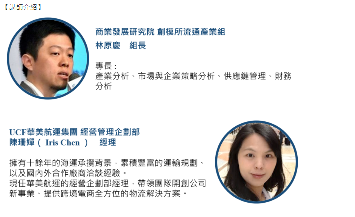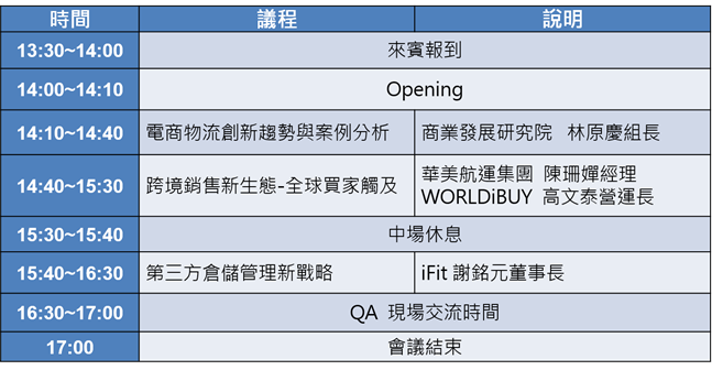 本次講座邀請商研院及UCF華美航運、WORLDiBUY、iFit等重量級業界人士與大家分享電商物流創新趨勢、海外標竿案例分析、跨境銷售的新生態與第三方倉儲管理,教大家如何在所有電商業者的兵家必爭之地 – 物流,締造創新的物流商業模式!