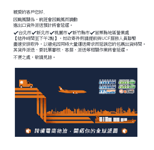 因颱風關係UCF華美航運部份營業站【結件時間至下午2點】