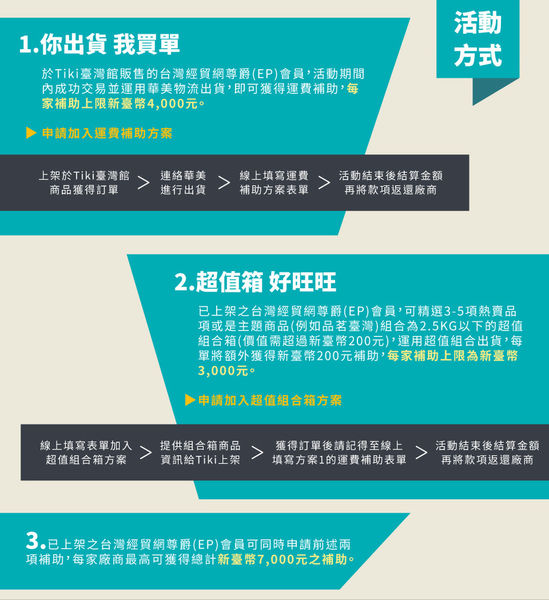 > 線上填寫運費補助方案表單> 活動結束後結算金額再將款項返還廠商