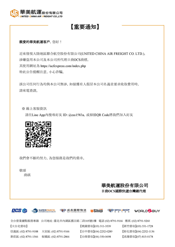 親愛的華美航運客戶,您好! 近來發現大陸地區聯合航空股份有限公司(UNITED CHINA AIR FREIGHT CO. LTD.), 涉嫌盜用本公司及本公司所代理日商OCS商標, 其使用網址為 https://ucfexpress.com/index.php 特此公告提醒注意,小心詐騙。