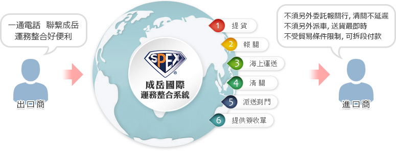 | 成岳國際物流獨創運務整合服務,簡化您的託運流程,結合自有報關系統提供您 包套優惠價,打破市場收費行情! | 我們推薦您使用成岳門到門服務,提供您中、日文報價單清楚載明涵蓋服務項目,包套一口價費用不因國外付款而任意高收,或更改單價,降低您的貿易糾紛。 |